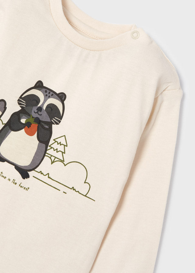 Cream long sleeved raccoon printed shirt with black sweatpants for baby boys.