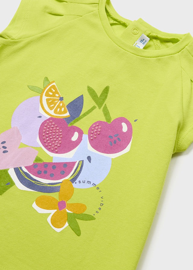 Short sleeved T-shirt for baby. Snap button fastening on the back to allow the garment to be put on easily. Decorative elements: decorative designs