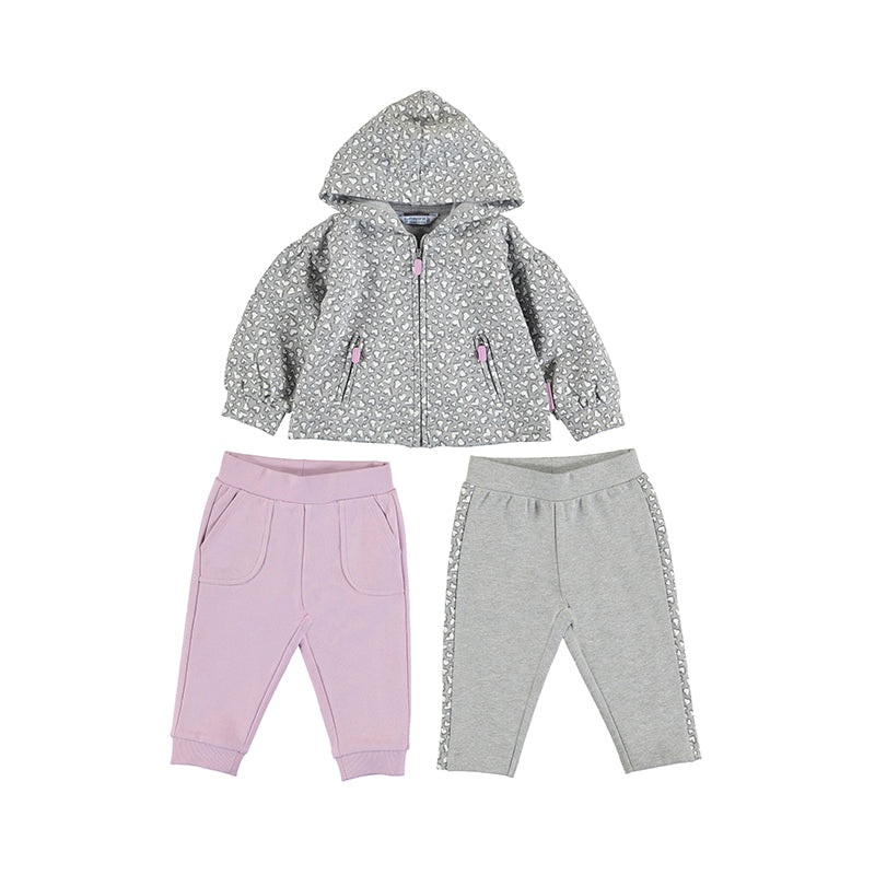 Get your little princess ready for playtime in this adorable Girls Silver Tracksuit Set. Complete with a cozy zipper sweater featuring cute white heart patterns, and two pairs of bottoms in pretty purple and grey with heart accents. She'll look stylish while staying comfortable! (Warning: may cause excessive cuteness!)