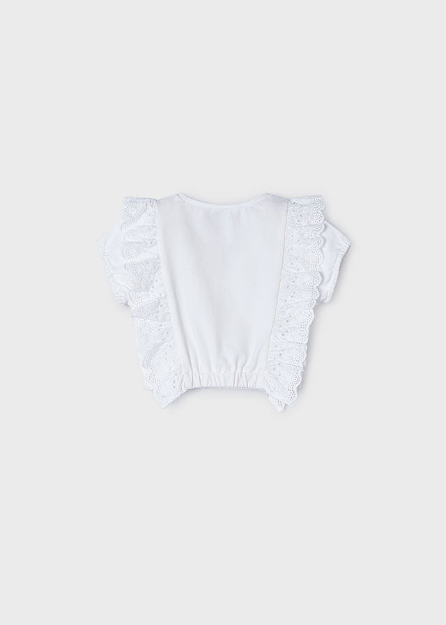 This shirt will make any little girl feel like a princess! The ruffled design and embroidered royal blue flowers add a touch of elegance to any outfit. Perfect for a special occasion or everyday wear. Fit for a queen (or just a sassy little diva).