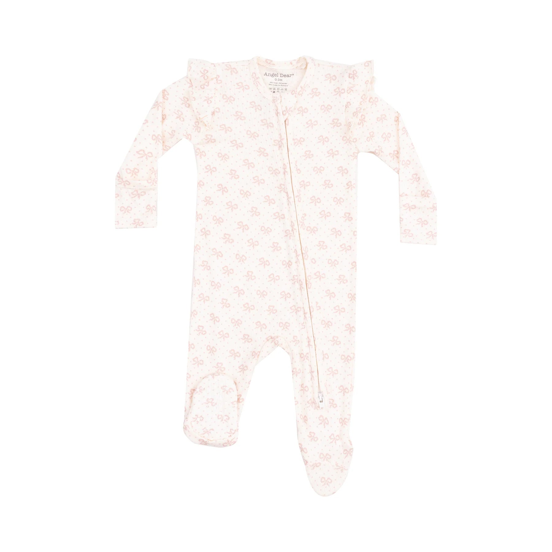 Be the talk of the town in our 2 Way Ruffle Sleeve Zipper Footie, featuring vintage mini bows! This playful design transforms from a footie to a romper with a simple zip, providing convenience and style. Get ready for some cuteness overload!
