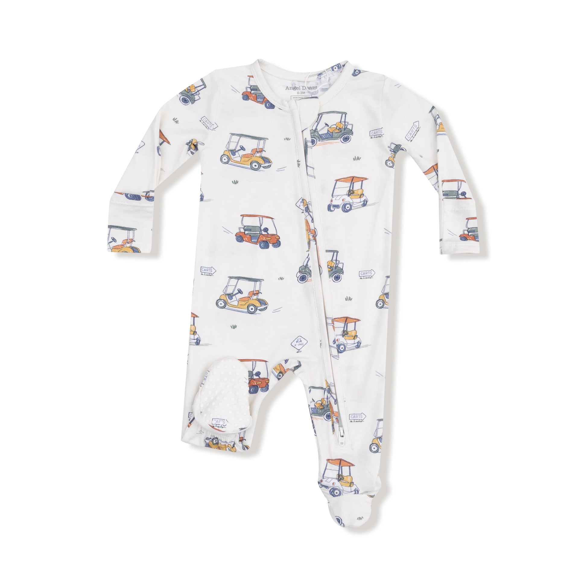 Keep little golfers cozy and ready for fun with the Zooming Golf Carts Footie. Featuring an easy 2-way zipper, this playful footie makes diaper changes a breeze, while the charming golf cart design adds a touch of sporty flair. Soft and snug, it’s perfect for naptime or playtime on the green!
